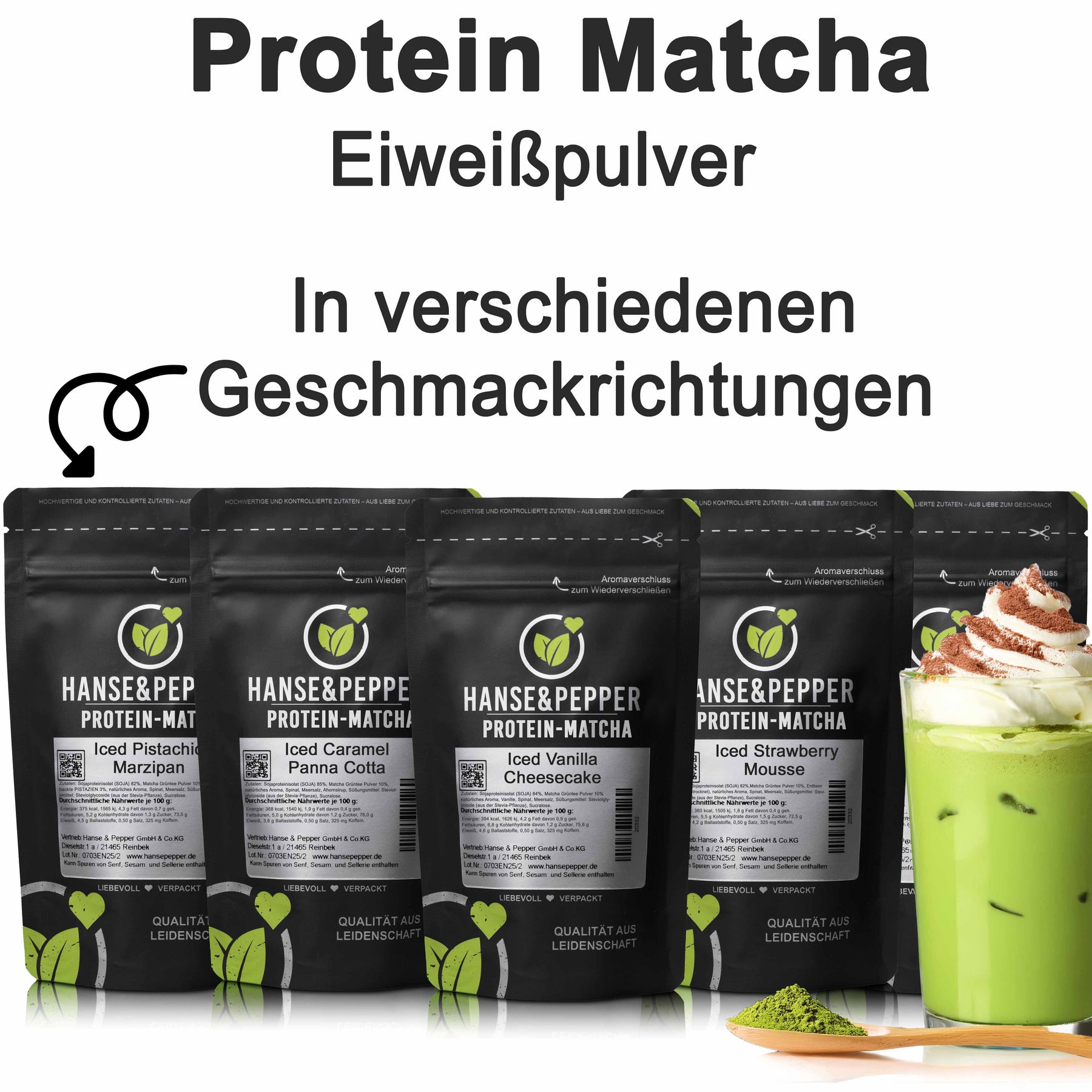 – In leckeren Geschmacksrichtungen – mit 10 % hochwertigem japanischem Matchapulver und echten Zutaten wie Erdbeer, Caramel- oder Vanillepulver