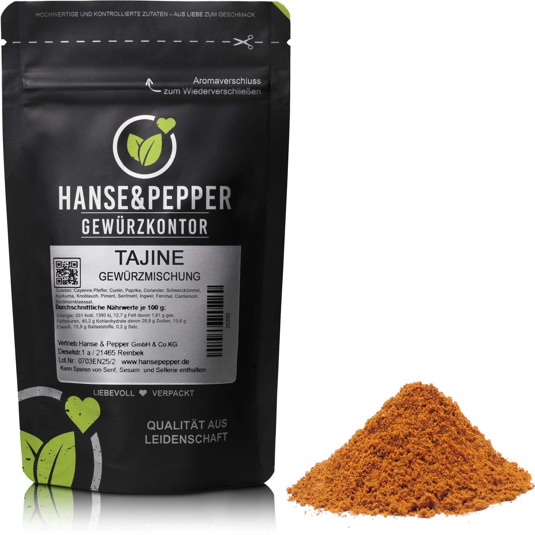 - Cayenne Pfeffer, Cumin, Paprika, Coriander, Schwarzkümmel, Kurkuma, Knoblauch, Piment, Senfmehl, Ingwer, Fenchel, Cardamom, Bockhornkleesaat.